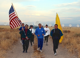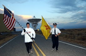 Runners carry U.S. and New Mexico flags past the 230-ton dish antennas of the VLA early on November 5, 2001